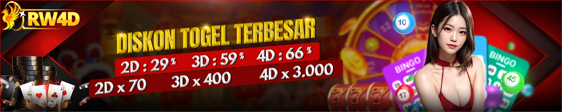 1. Diskon Togel : 2D = 29% | 3D = 59% | 4D = 66%